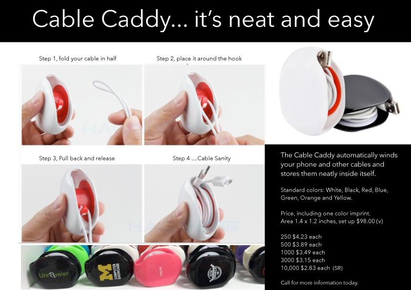 It’s automatic, it’s the CABLE CADDY, the easiest way to carry phone cables in a purse or pocket. Automatically winds and stores.