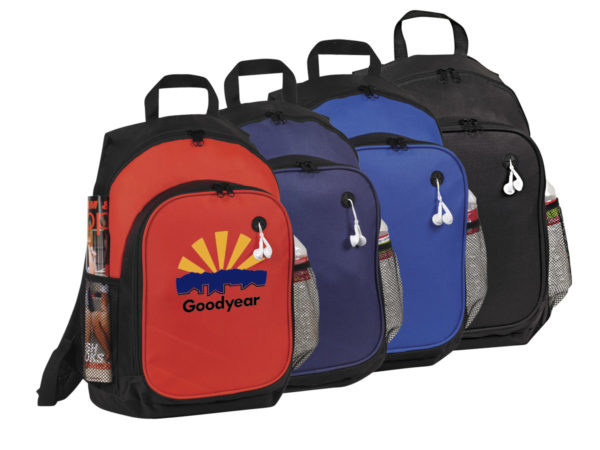 Features: Back Pack; Zipped main and front pockets; 2 side mesh pockets for water bottles; Padded shoulder straps, Top grab handle, Eaphone Port; Double zipper pulls.