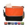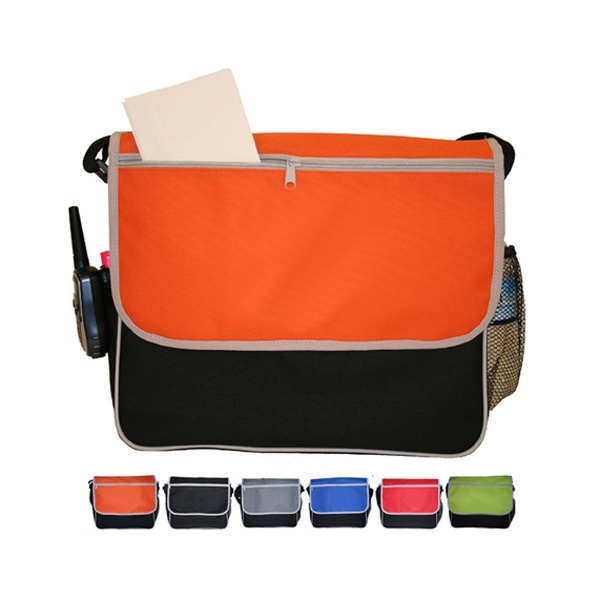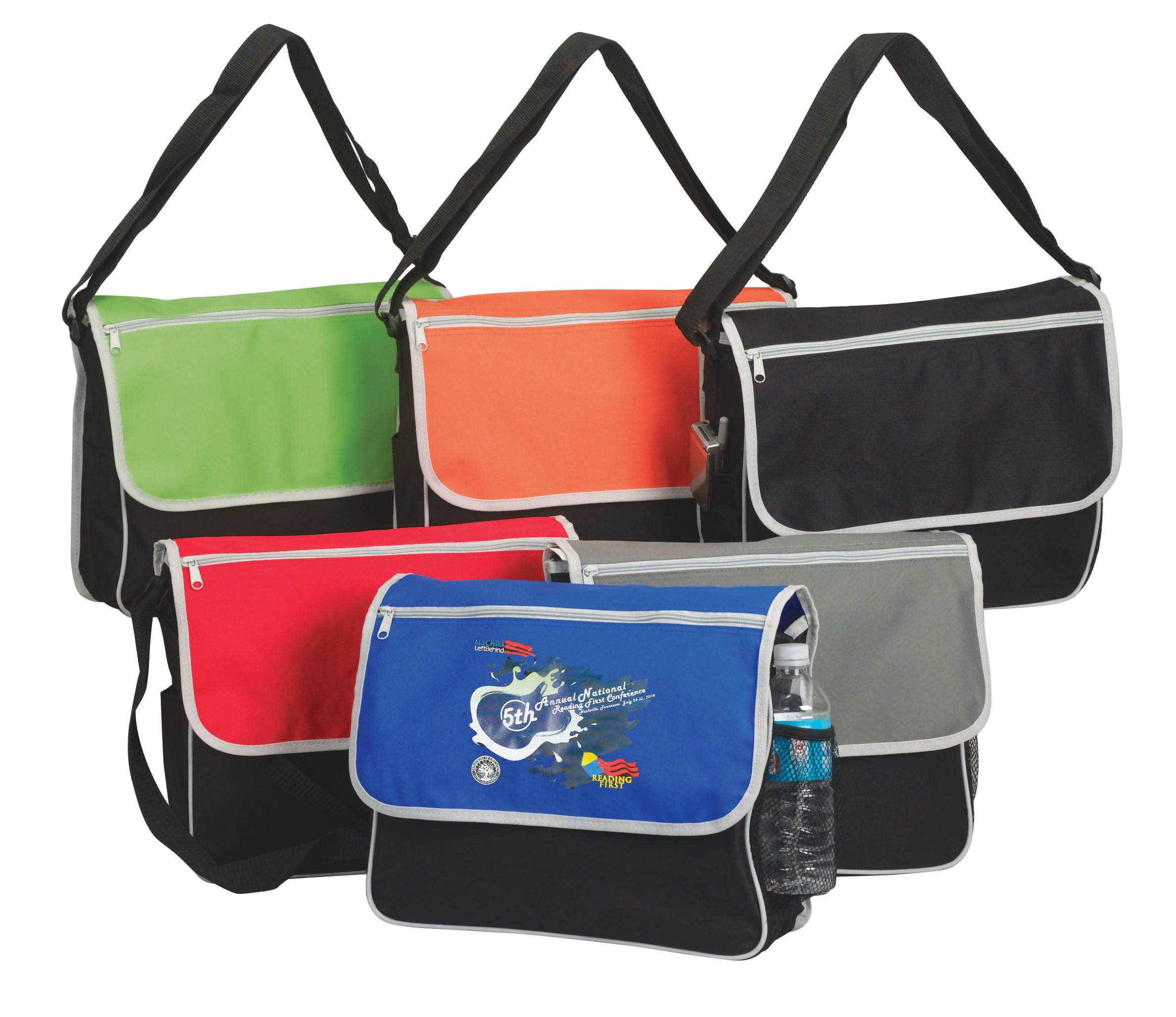 Features: Messenger Bag with front zipper pocket, open side pocket and side mesh pocket for water bottle. Color trim on flap with contrast webbing. Adjustable shoulder strap 29 to 54″. Velcro closure.