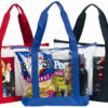 Features: Security clear tote; Full zipper top gusset; Front clear pocket; Colored 600D handles & bottom.