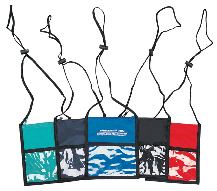 Features: Ideal for most passports; Zipper top opening; Large main pocket, Clear PVC front for badge display; Adjustable strap using using push button lock.