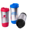 It is a 16oz, Stainless steel with plastic liner and flip top lid. Comes in Red, Blue and Black. Can be printed or engraved. With Hour Glass shape to help grip.