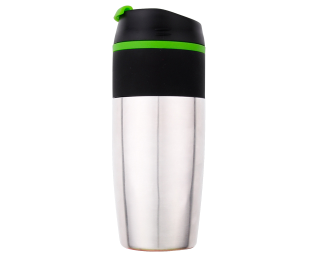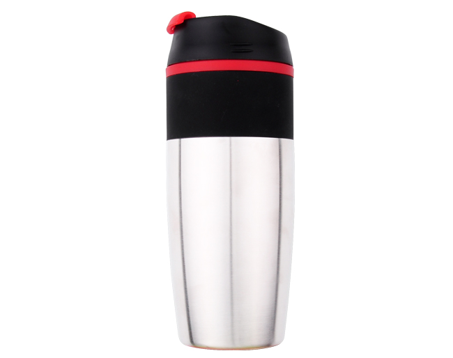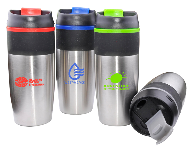 It is a 16oz, Stainless steel with plastic liner and flip top lid. Comes in Red, Blue, Green and Grey. Can be printed or engraved.