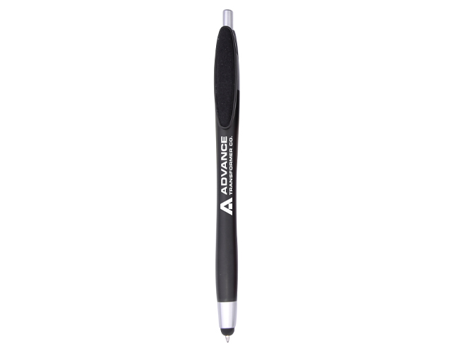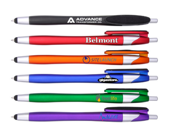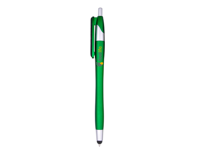 With colored barrel with and silver trims.Screen cleaner on the clip.