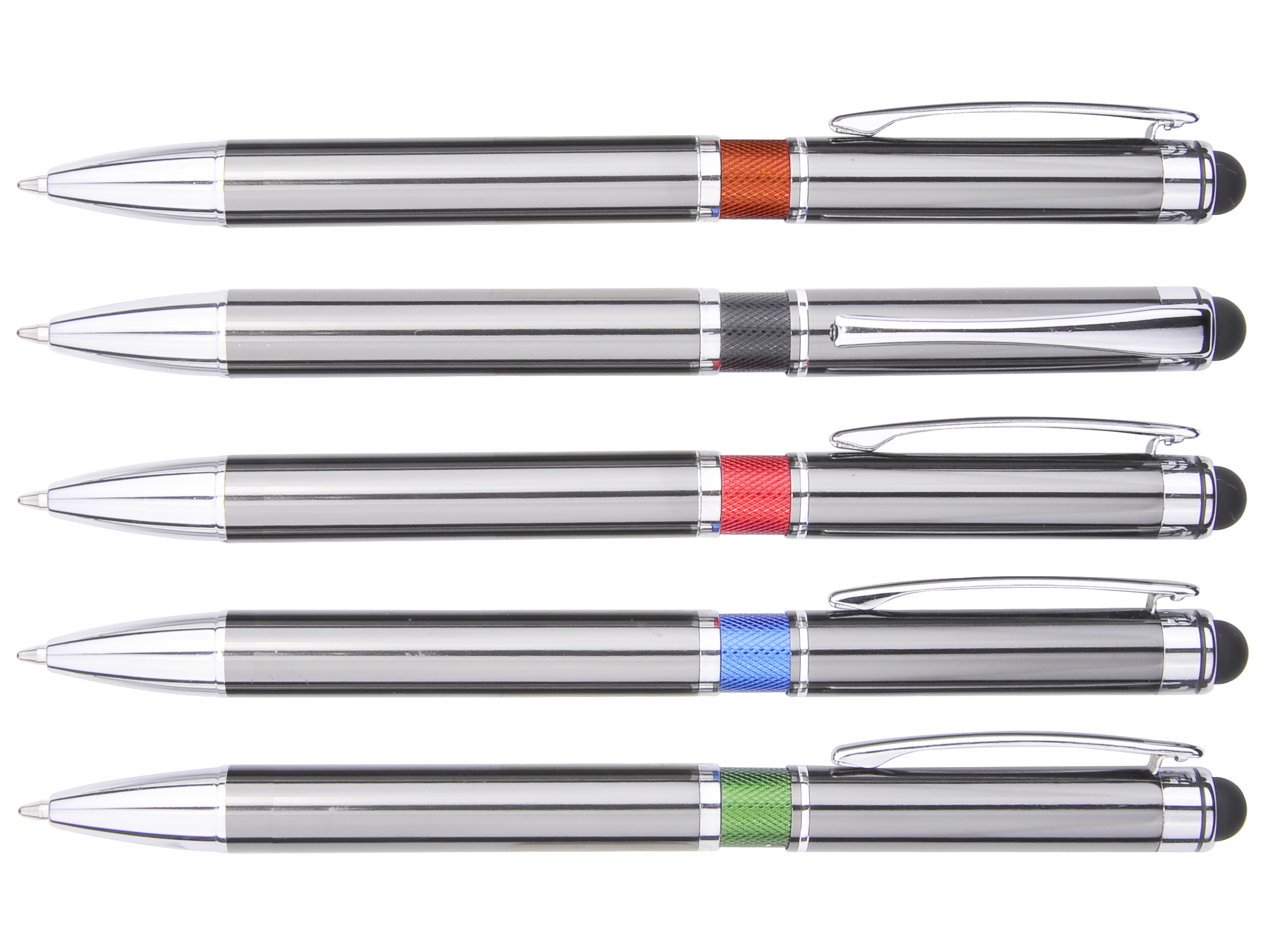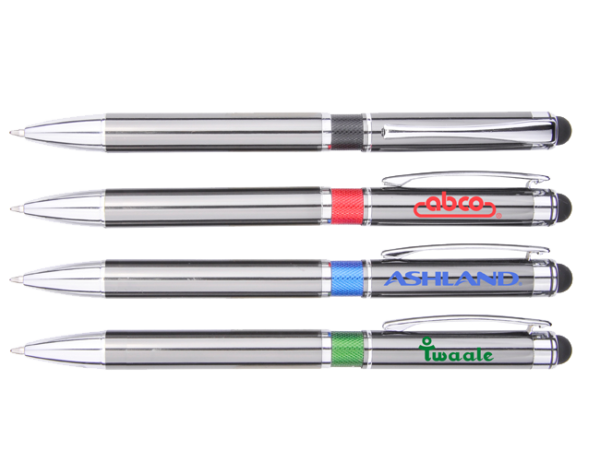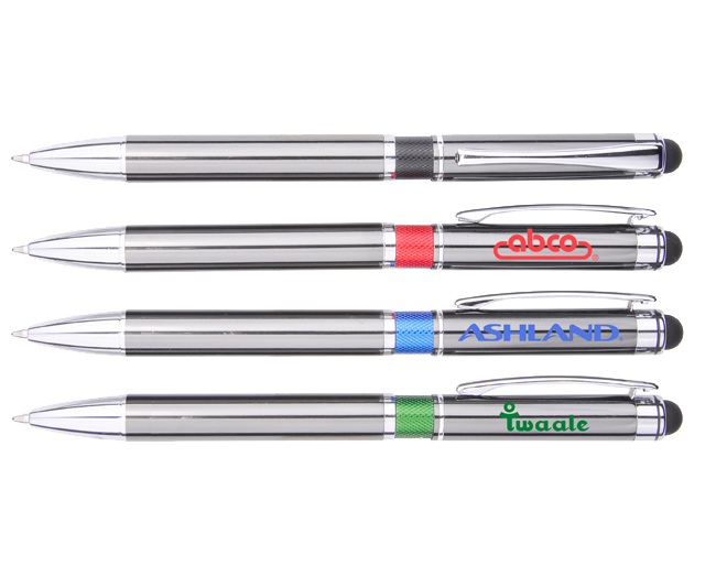 Our DPP 33 Aluminum Ball Pen with Stylus and colored Milled Rings. Very popular pen.