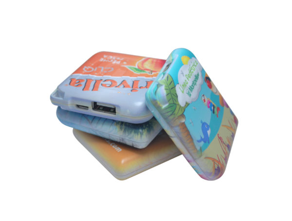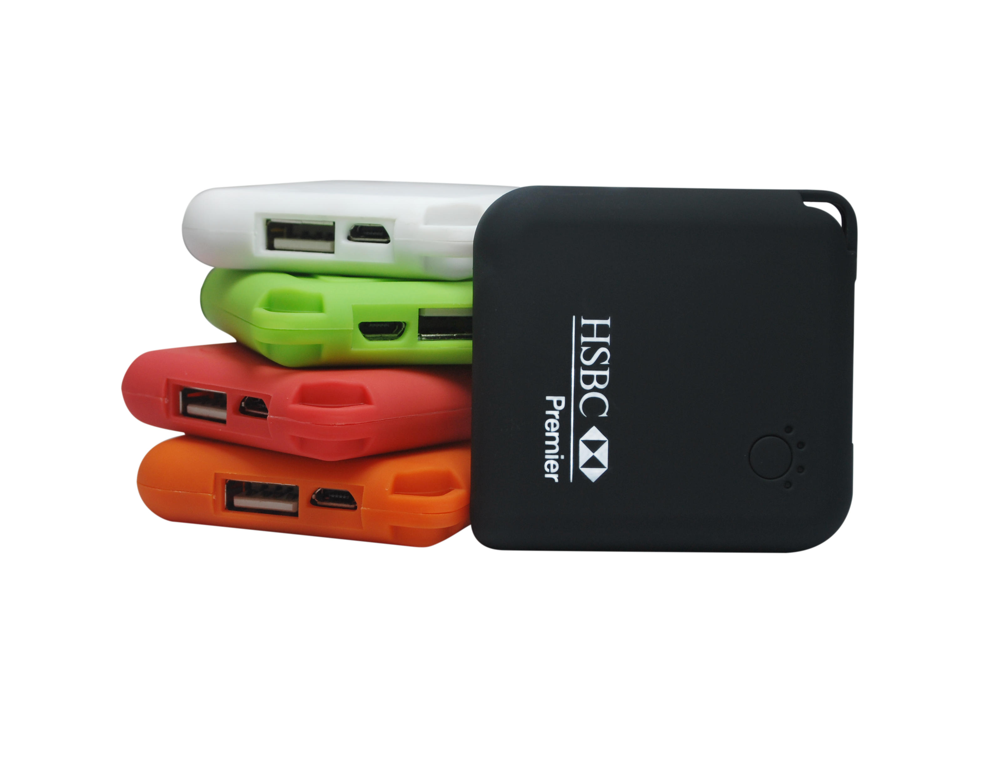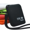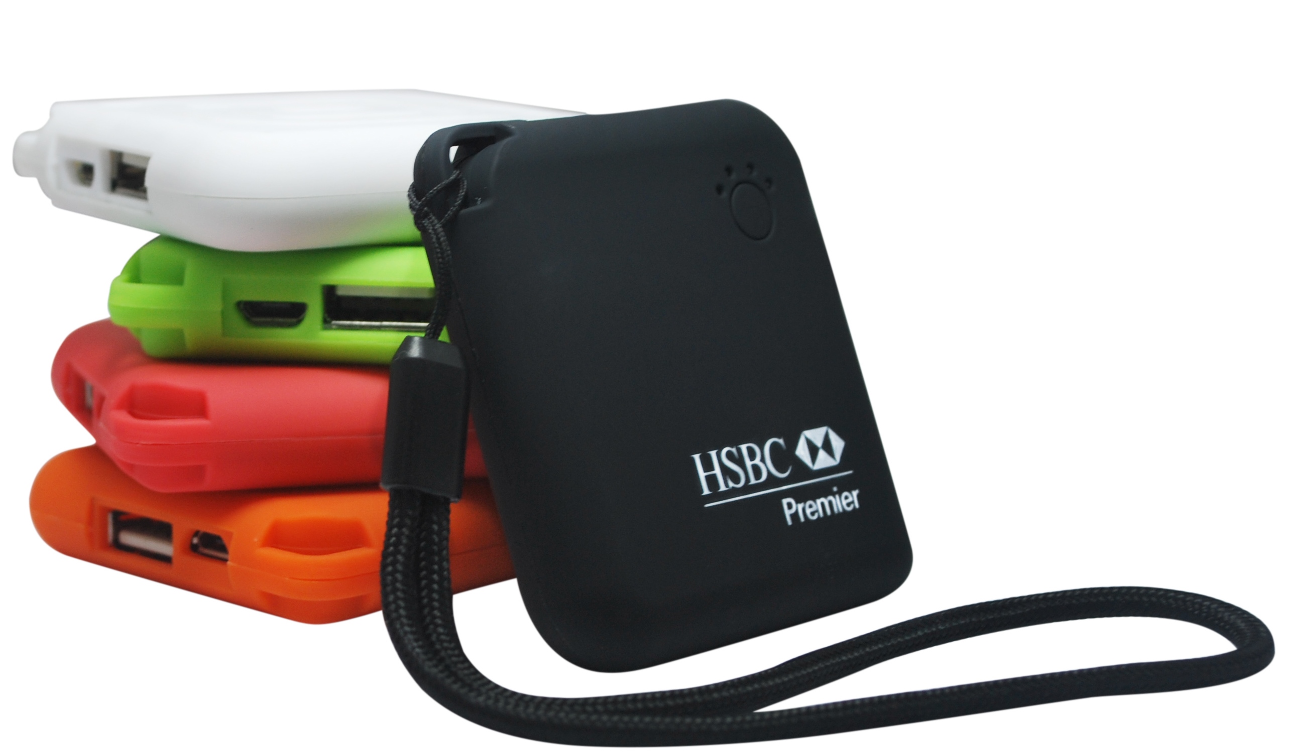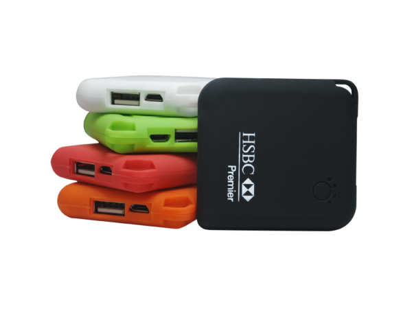 Our PB 109 Soft Feel, Slender, Pocket Power Bank – 2000 mAh with Black Wrist Strap. Color Wrist Strap Available for $.25/pcs (r).