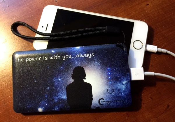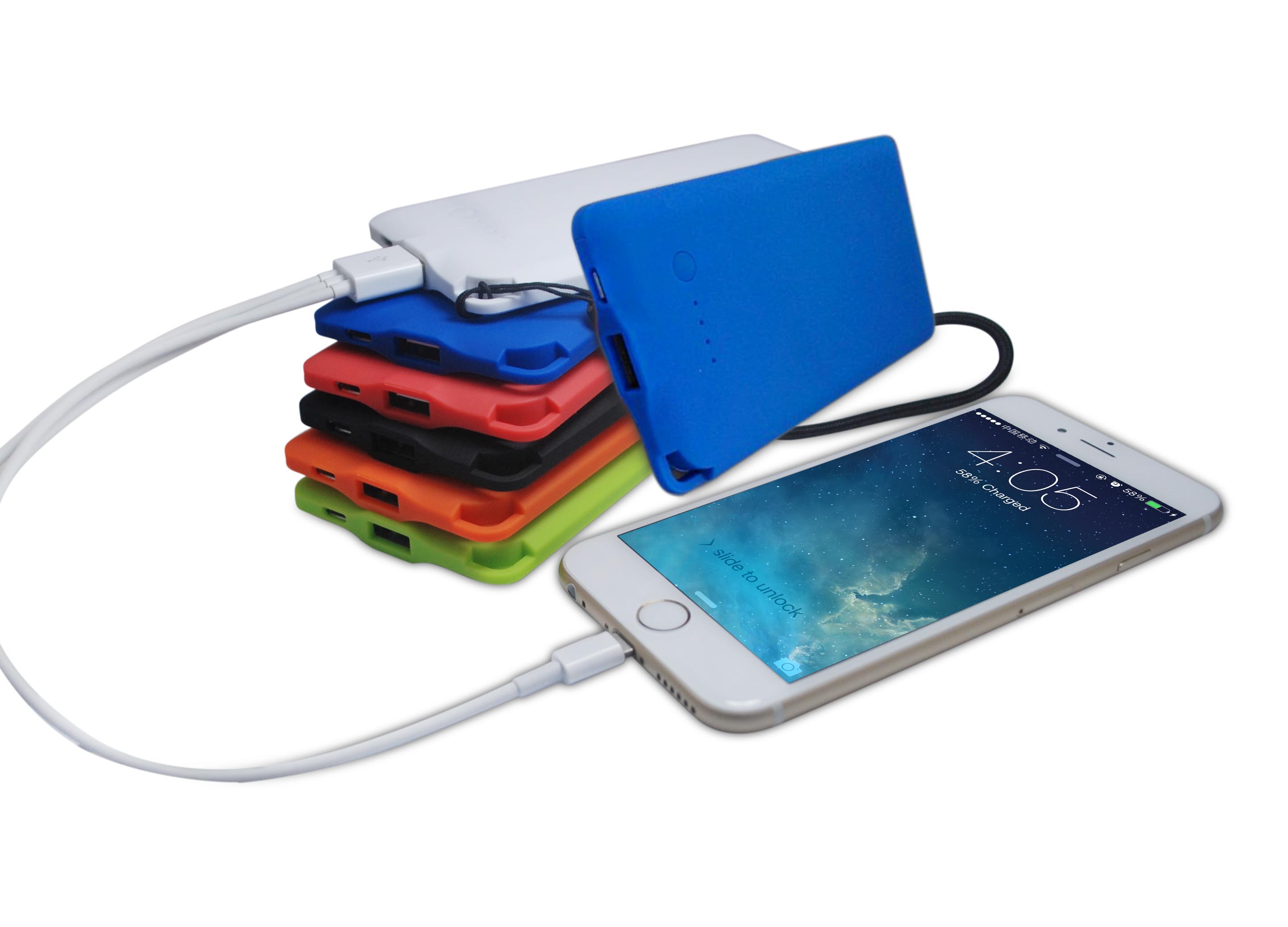 Our PB 119 Soft Feel, Slender, Pocket Power Bank – 4000 mAh with Black Wrist Strap. Color Wrist Strap Available for $.25/pcs (r).