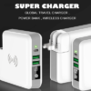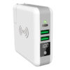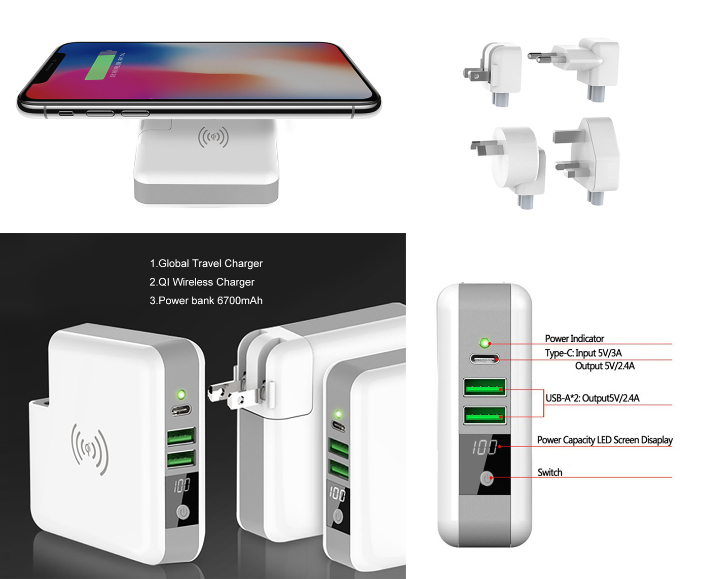 AU333 Our Massive Hit Product, The New 3 in 1 Wireless Qi Power Bank Universal Traveler. Features: 6700 MAH Powerbank with Dual USB Charge Ports, Plus wireless Charge Station, also has a USB C charging port, and mains charging via universal plugs (choose from 4 world zones).